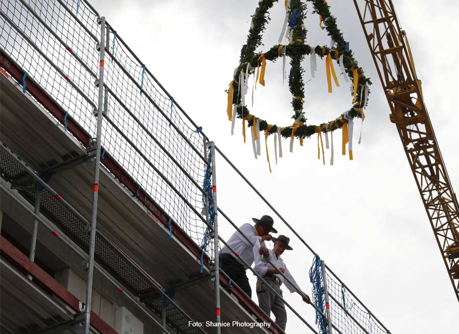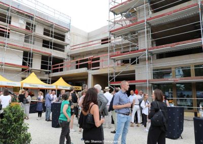 Bauleiter ist Maximilian Martin von Generalunternehmer Reisch in Bad Saulgau. Er berichtet, wie weit der Neubau aktuell fortgeschritten ist: Die letzte Decke des Flachdach-Gebäudes wurde wenige Tage vor dem Richtfest betoniert. Die Badezimmer sind schon fast alle drin: Sie sind vormontiert, werden als komplette Fertig-Nasszellen angeliefert, schweben per Kran ins Gebäude und werden dann positioniert. Auch ein Großteil der Fenster ist bereits eingebaut. der Putz ist stellenweise schon drauf, Trockenbauer sind an mehreren Stellen in Gebäude zugange. „Wir arbeiten mit allen Gewerken von unten nach oben“, erklärt Martin. Er ist sicher: „Wir werden den vereinbarten Übergabe-Termin einhalten können.“